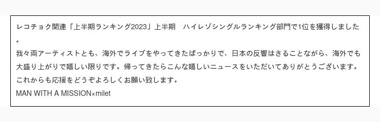 【MAN WITH A MISSION×milet 「絆ノ奇跡」がハイレゾシングルランキング部門で1位!】