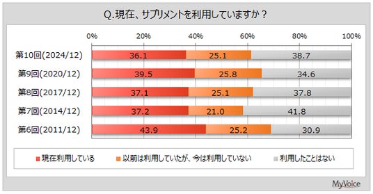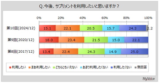 マイボイスコム株式会社(東京都千代田区、代表取締役社長:高井和久)は、10回目となる『サプリメントの利用』に関するインターネット調査を2024年12月1日~7日に実施しました。