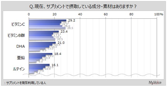 「ビタミンC」が29.2%、「ビタミンB群」「DHA」が各2割強、「亜鉛」が18.4%となっています。