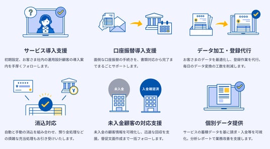 請求書の発行から入金消込、口座振替依頼書の処理、未入金催促まで、煩雑な請求業務を、システムと企業ごとの課題に応じた柔軟な業務代行オプションの組み合わせによりワンストップで提供します。高機能なシステムと専門オペレーターによる最適な業務プロセスとして提供することで、企業の請求業務の効率化と品質向上を支援します。