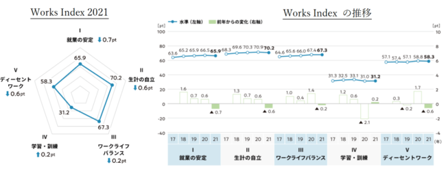 株式会社リクルート(本社:東京都千代田区、代表取締役社長:北村 吉弘)内の、人と組織に関する研究機関・リクルートワークス研究所は、全国およそ5万人の同一個人の就業実態を毎年追跡調査する「全国就業実態パネル調査(JPSED)」を実施しています。この結果より、日本における働き方を5つの側面から可視化し、独自に評価した「Works Index」を作成しています。このたび2021年の結果がまとまりましたのでご報告いたします。
