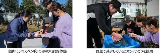ファミリースクール「オルシーと知るsea」では、神戸須磨シーワールドで飼育するシャチの詳しい生態についてシャチトレーナーが解説を行います。ドルフィンスタディアムでは、イルカのサイン出しや給餌体験を楽しみながら学ぶことができます。またアクアライブでは、ペンギンを間近で観察しながら、その体の構造や繁殖について学べるプログラムを実施。擬卵に実際にふれることでペンギンの卵の大きさをご体感ください。