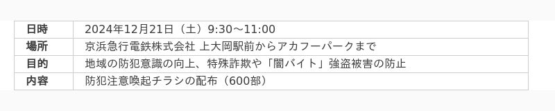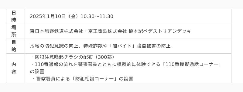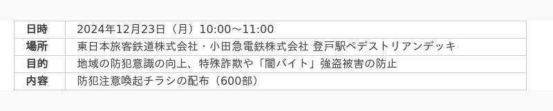 株式会社ジェイコム湘南・神奈川(J:COM、本社:神奈川県横浜市、代表取締役社長:京克樹)は、神奈川県港南警察署、多摩警察署および相模原北警察署と共同で、特殊詐欺被害や「闇バイト」をきっかけとする強盗被害(特殊詐欺被害等)を防止するため、年末年始の防犯意識向上を目的とした官民連携イベントを、各管内で2024年12月下旬から2025年1月上旬にかけて実施しました。