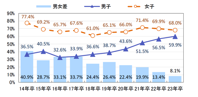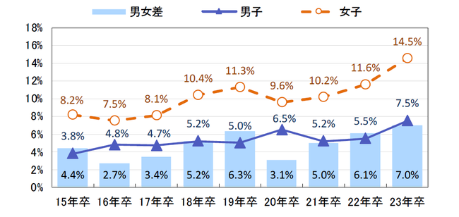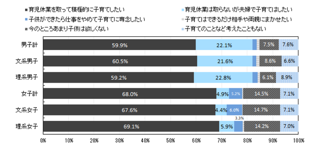 子育てについて「育児休業を取って積極的に子育てしたい」と回答した割合は、男子は59.9%(前年比3.4pt増)、女子は68.0%(前年比1.9pt減)だった。男子は7年連続の増加となり、14年卒の調査開始以来、最高値を4年連続で更新した。また、「今のところあまり子供は欲しくない」の割合は、男子が7.5%(前年比2.0pt増)、女子が14.5%(前年比2.9pt増)で、いずれも調査開始以来最も高い結果となった。【図3、4、5】