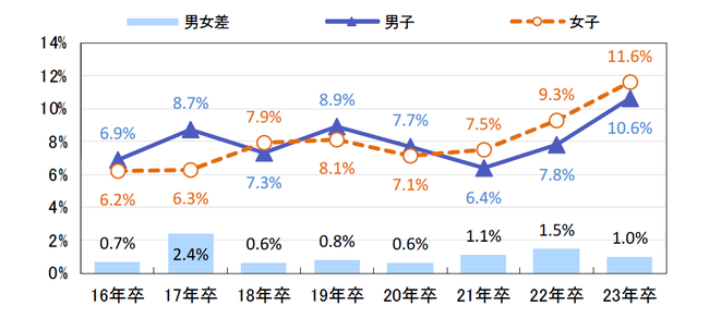 23年卒の大学生・大学院生に結婚後の仕事に関する考えを聞いたところ、「夫婦共働き」を希望する割合は、男子 59.9%(前年比1.0pt増)、女子 74.5%(前年比0.8pt減)だった。また、「結婚せず自分の収入のみで生活するのが望ましい」を選んだ割合が、男女とも調査開始以来最も高い割合となり、初めて1割を超えた。【図1、2】
