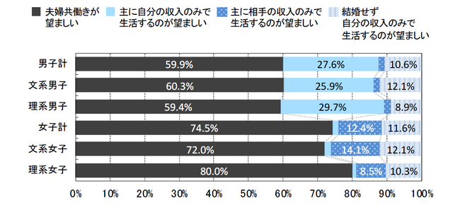 「夫婦共働き」を希望する割合は男子59.9%、女子 74.5%。結婚を望まない割合は男女とも初めて1割を超える【図1、2】