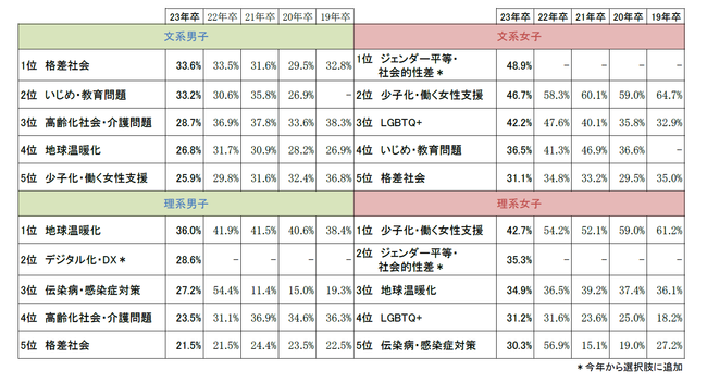 興味のある社会問題については、前年1位だった「伝染病・感染症対策」は前年比27.4pt減の24.7%だった。代わって1位となったのは「少子化・働く女性支援(33.2%、前年比7.3pt減)」で、理系女子でも1位(42.7%、前年比11.5pt減)だった。文系女子の1位は「ジェンダー平等・社会的性差(48.9%)」で、文系男子では「格差社会(33.6%、前年比0.1pt増)」が初の1位となった。理系男子では「地球温暖化(36.0%、前年比5.9pt減)」が1位だった。【図6、7】
