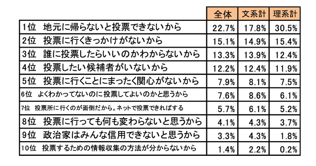 これまでに選挙で投票したことがあるか聞いたところ、「はい」と回答した割合は79.2%で、多くの学生に投票経験があることがわかった。投票に行ったことがない人に行かない最大の理由を聞いたところ、1位は「地元に帰らないと投票できないから(22.7%)」だった。【図8、9】