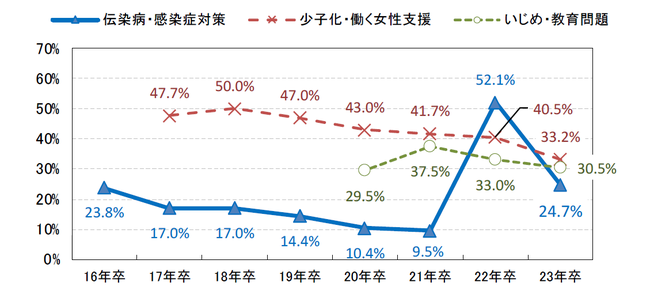 興味のある社会問題で「伝染病・感染症対策」が半減するほどwithコロナが日常化する中、女子を中心に「少子化・働く女性支援」や「ジェンダー平等・社会的性差」が非常に高い関心を集めています。結婚の形も、男女の共通認識として「共働き」が多数派で、夫婦が共に働き続けることを前提に自分の将来や「子育て」を考えることが、今年就職活動をする学生にとっては当たり前になっているようです。今後、彼らは就職先の企業について考えていく中で、自分自身と自分のパートナーとなる人が、結婚や子育てを経ながら共にやりがいを持って働き続けるために、「働く女性支援」や「社会的性差」の問題に対峙していくことでしょう。彼らを採用する立場である企業は、こういった彼らの問題意識に真摯に向き合うことが大切だと考えます。