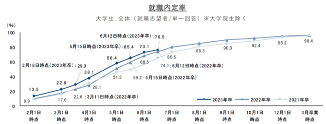 就職内定率は76.5%で、6月1日時点に比べ3.4ポイント増加。内定取得者のうち、2社以上内定を保有している学生の割合は19.3%