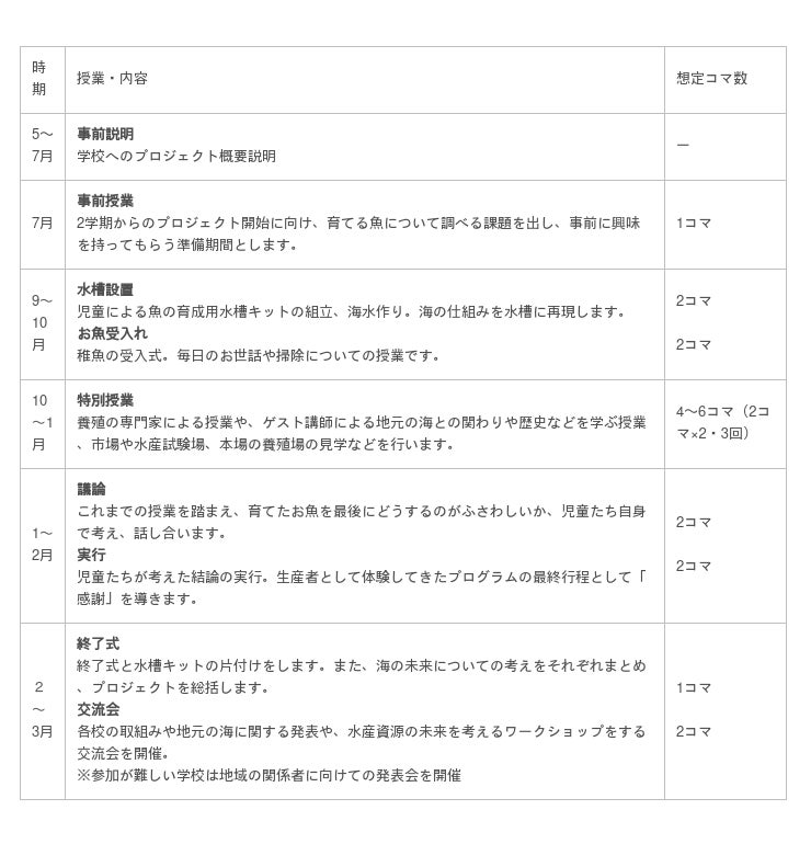 子供たちが約半年かけて養殖体験を行い、海に関する地域学習で学んだことを基に、育てたお魚を最後にどうするのがふさわしいかを自分たちで考えます。半年間の全てのプロセスを「自分ごと化」し、大人になっても忘れない海と生き物への愛着と感謝の心を育む教育プログラムです。