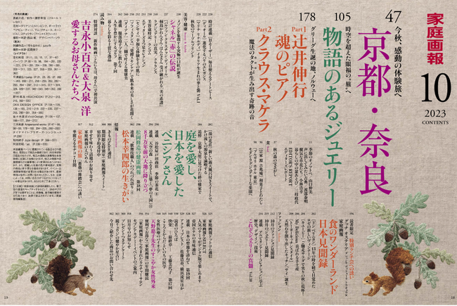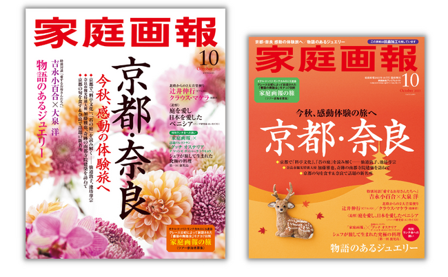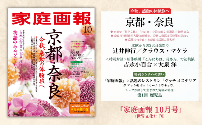 株式会社世界文化社は、『家庭画報 10月号』を9月1日(金)に発売します。今号の巻頭特集では、秋の京都・奈良を大特集。京都では「料亭文化」「禅の庭」を、奈良では奇跡的に現存する南都奈良の6社寺・古代建築の魅力に迫るとともに新名所をご紹介。また、「グリーグ生誕の地、ノルウェーへ」では、ベルゲン国際芸術祭での辻井伸行さんを単独密着取材。新作映画「こんにちは、母さん」で初共演の吉永小百合さんと大泉洋さんの特別対談も必見です。