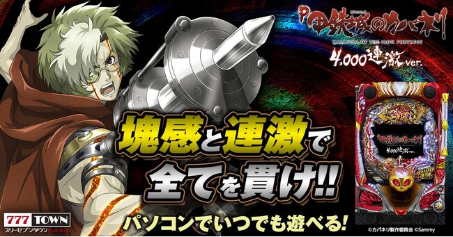 株式会社サミーネットワークスが運営するPC向けぱちんこ・パチスロオンラインゲーム「777TOWN.net」(スリーセブンタウン・ドットネット)は、2023年8月21日(月)より、サミー株式会社の「P甲鉄城のカバネリ ~4,000連激ver.~」アプリを配信いたします。