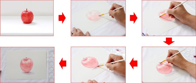 「静物(りんご)」「花(はな)」「風景(富士山)」の3つのモチーフをテーマに野村先生が水彩画の描き方を解説。1工程ずつポイントと一緒に写真付きで紹介します。
