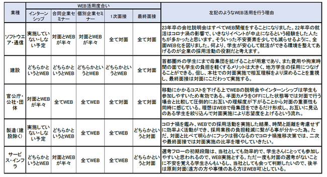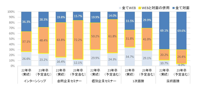 WEB活用の予定について22年卒と比べると、23年卒では「全て対面」「全てWEB」のように開催形式を固定している割合が減り、WEBと対面を併用する傾向にある。一方、最終面接のみ「全て対面」とする割合が69.6%で高い結果となった。採用担当者のコメントを見てみると「WEB形式で説明会を実施することで遠方の学生にも参加してもらえる」「WEBの導入で採用業務の負担軽減につながる」「一度も会わないことに不安を覚える学生もいるので面接は対面でも実施する」などの意見が挙がった。【図6、7】