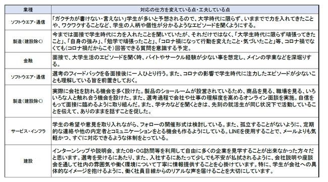 学生生活の3分の2をコロナ禍で過ごした23年卒の学生に対して、企業が採用活動で行っている(予定の)工夫を自由回答で聞いたところ、「ガクチカではなくコロナ禍で気づいたこと、工夫したことを聞く」「孤立させない交流の機会づくり」などの意見があった。例年の面接で聞いていたガクチカ(学生時代に力を入れたこと)については、コロナ禍の大学生活で活動の制限があったことでエピソードが少ないことを踏まえて、他の質問をすることで学生の人柄を引き出す工夫をしていることがわかった。【図8】