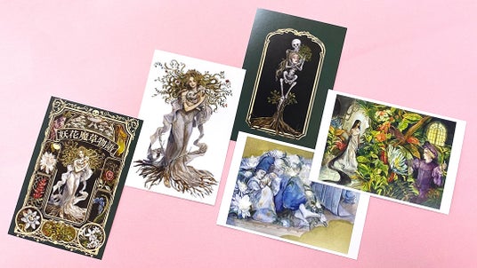 本展の開催にともない、2024年9月6日(金)より、2階 ギャラリー1前にて『妖花魔草物語』の両著者サイン本(特製ポストカードセット入り)を販売します。数に限りがあるため、売り切れの場合はご了承ください。事前のご予約やお取り置きはできません。