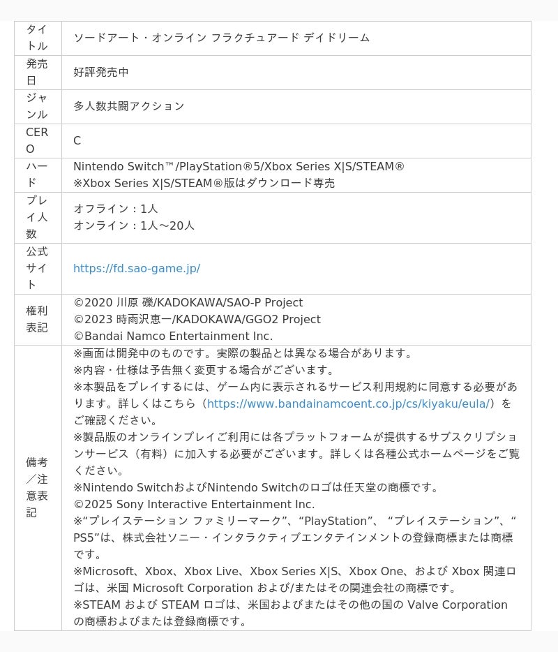 株式会社バンダイナムコエンターテインメントは、Nintendo Switch(TM)/PlayStation(R)5/Xbox Series X|S/STEAM(R)『ソードアート・オンライン フラクチュアード デイドリーム』につきまして、