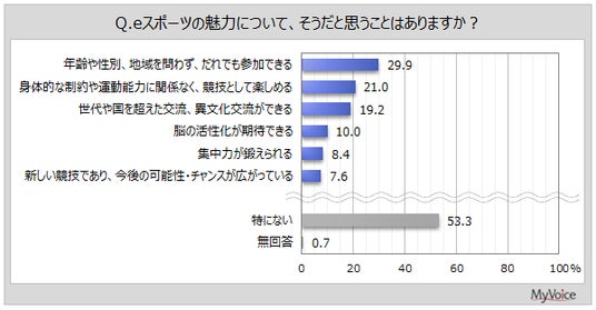 eスポーツの魅力は(複数回答)、「年齢や性別、地域を問わず、だれでも参加できる」が29.9%、「身体的な制約や運動能力に関係なく、競技として楽しめる」が21.0%、「世代や国を超えた交流、異文化交流ができる」が19.2%です。