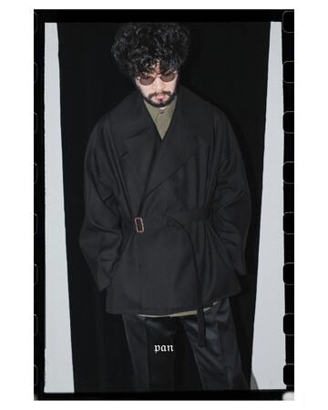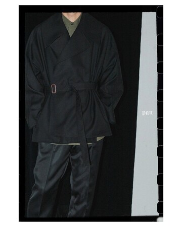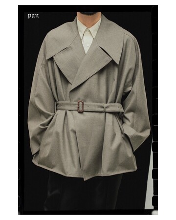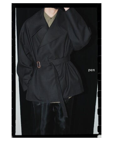 ショートトレンチはpanが考える男性像がベースにある。デザイナーの出身地である愛知県一宮市の梳毛を高密度で織りあげたウールを使用。オフスカル加工によってドライ感のあるヴィンテージの様な風合いを出している。この生地を見てから形を考えたという通り、素材を活かした優雅なシルエットで、さまざまな体型に合い、自由なバランスで着用できるコートが完成した。