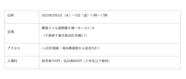 2023年5月3日(水)~5月5日(金)<幕張メッセ国際展示場1ホール~6ホール>