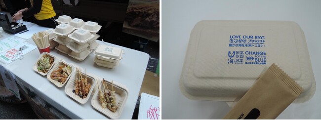 また、会場内のフードエリアの一つを「LOVE OUR BAY フードコート」と題して、海洋プラスチックごみ問題を考え削減していくために、プラスチックフリーの容器で料理を提供していきます。この容器は材料が「竹」とサトウキビの搾りかすの「バガス」で、100%天然素材のため、プラスチックの削減はもちろん、万が一ごみとしてこぼれ出ても最終的には自然に還りプラスチックごみにはなりません。この容器で4万食分の食事を提供することで、海洋プラスチックごみ問題を考えるきっかけ作りをしていくことが目的です。