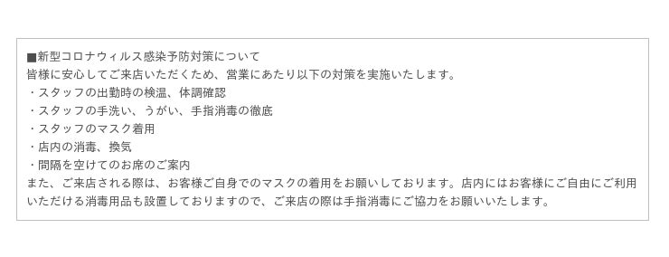 また、皆様に安心してご来店いただくため、営業にあたり以下の新型コロナウィルス感染対策を実施。こちらも同じく下記、もしくは公式サイトをご確認下さい。