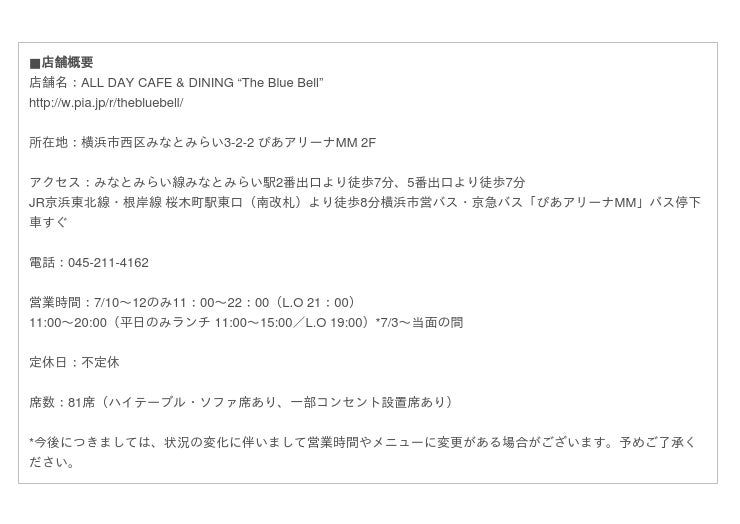 ぴあ株式会社では、新型コロナウイルスの感染拡大防止措置を受け、開業を延期しておりました「ALL DAY CAFE & DINING “The Blue Bell”」を明日7月10日(金)に開業いたします。