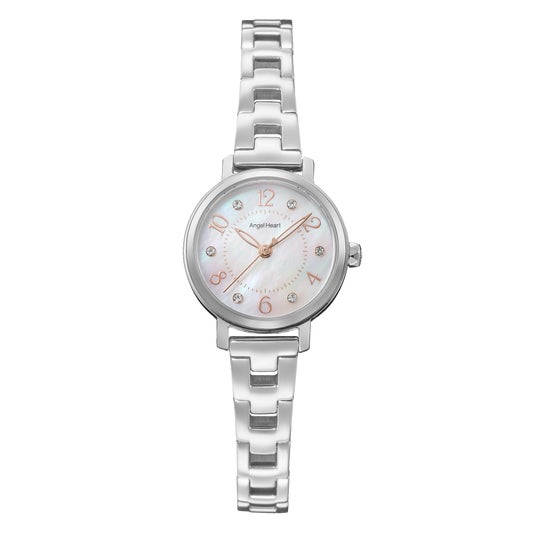 文字盤のクリスタルとパール素材がきらりと輝くエンジェルハートベストセラーモデル。ブレスレットとケースにはシルバーカラー、インデックスと針にはピンクゴールドカラーを使用することで、どんなアクセサリーにも合わせやすいデザインです。