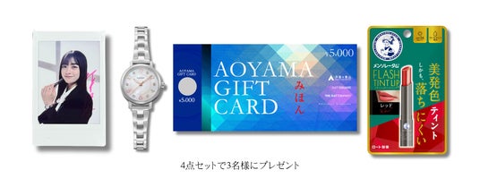 応募カード記載のQRコードより必要事項を記入・購入レシートのお写真を添付の上、ご応募いただいた方の中から抽選で10名様に全国の洋服の青山で使用可能なギフトカード20,000円分をプレゼントいたします。