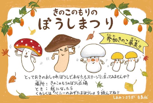 今日は、森のきのこの帽子祭り。みんながとっておきの新しい帽子をおひろめする中、ベニーだけはいつもの水玉帽子を脱がなくて…?