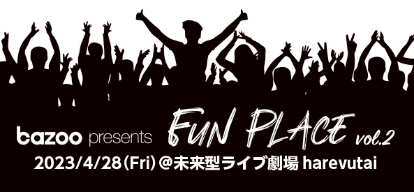 bazoo presents FUN PLACEは、多くの方が様々なアーティストの音楽を楽しんでいただける場=“Fun Place”を作っていきたいという想いのもと、PCI MUSICやbazooからリリースのあるアーティストをピックアップし、ライブハウスがみんなの遊び場となるようなイベントとして開催しているイベントである。