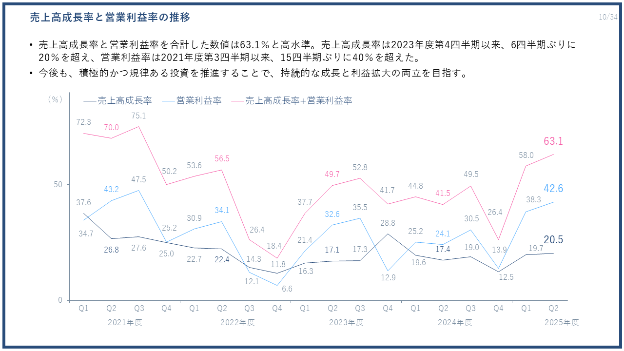 売上高成長率と営業利益率を合計した数値は、63.1%と高水準を実現しました。売上高成長率は2023年度第4四半期以来、6四半期ぶりに20%を超え、営業利益率は2021年度第3四半期以来、15四半期ぶりに40%を超えました。