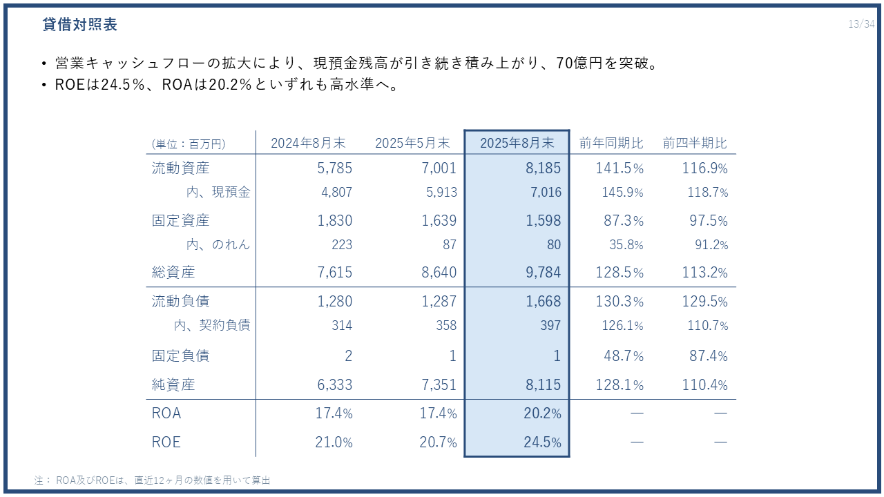 業績概況の最後に、バランスシートを紹介します。営業キャッシュフローの拡大により、現預金が引き続き積み上がり、70億円を突破しました。ROAは20.2%、ROEが24.5%といずれも高水準で、資本効率と収益性の両立を示しています。