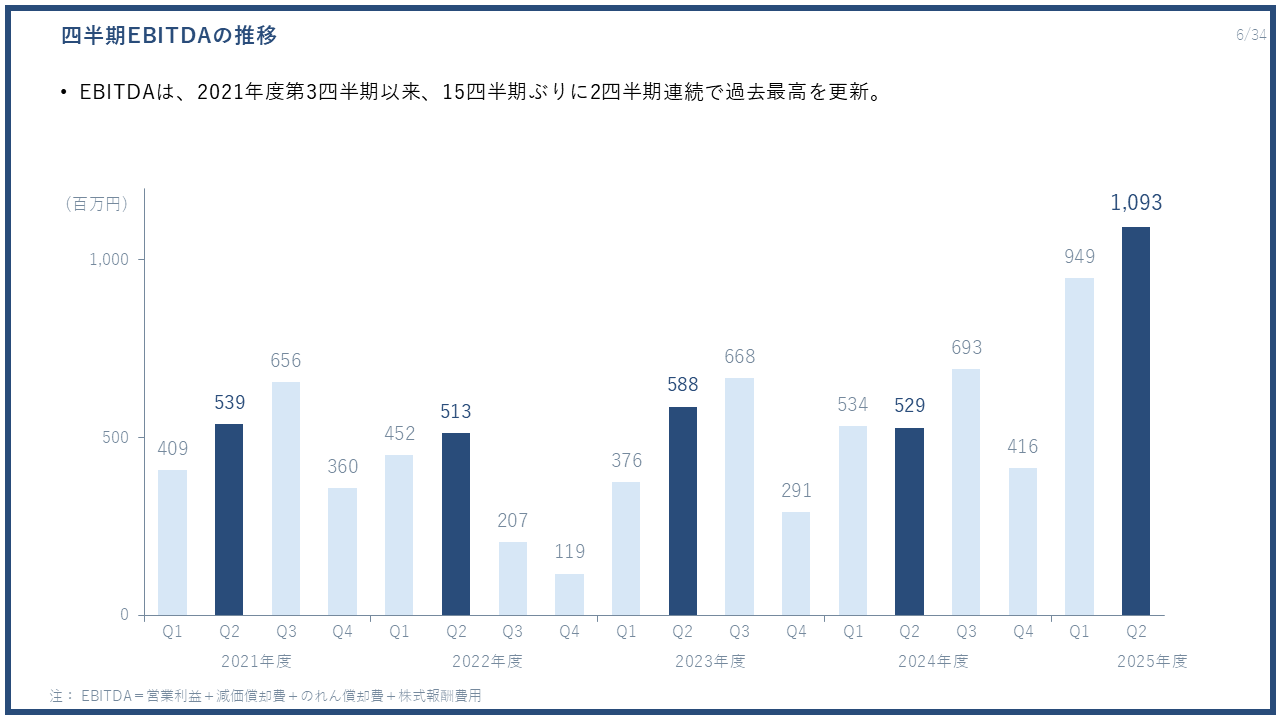 四半期EBITDAは、2四半期連続で過去最高を更新しています。2021年度第3四半期以来、15四半期ぶりの記録であり、収益力の底上げを示すものです。