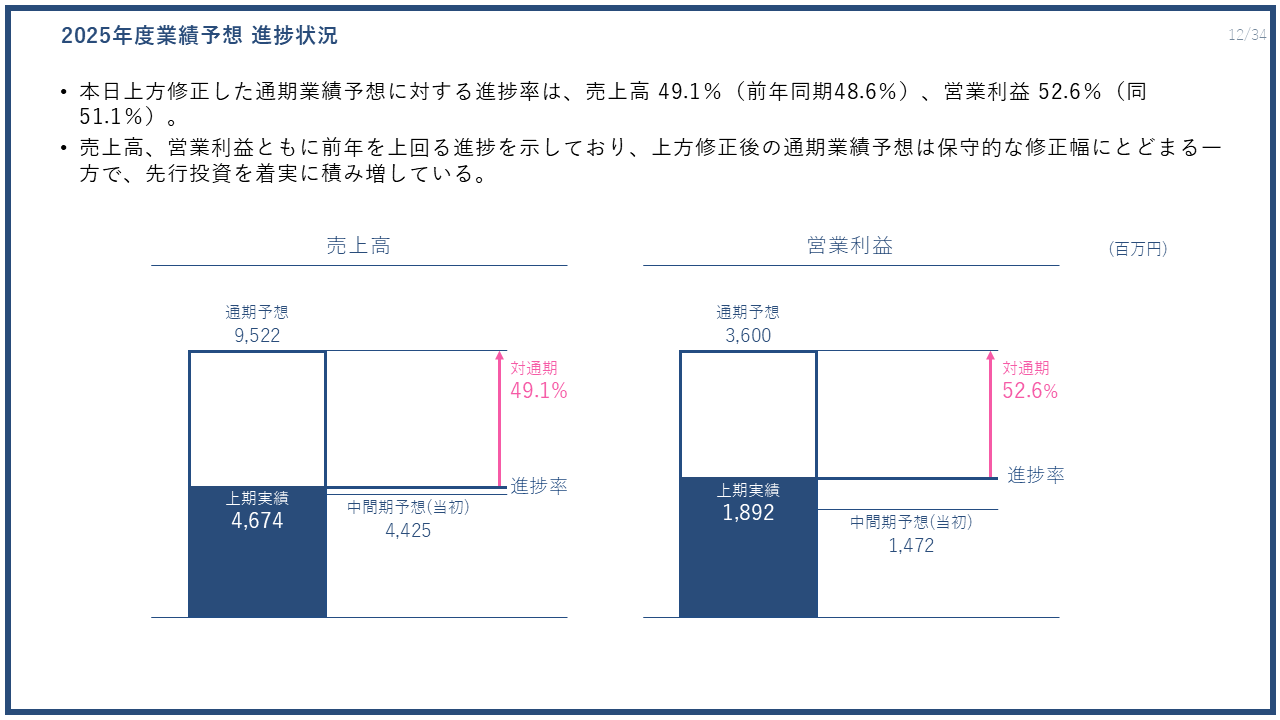 本日上方修正した通期業績予想に対する進捗率は、売上高49.1%(前年同期48.6%)、営業利益52.6%(同51.1%)となっています。売上高、営業利益ともに前年を上回る進捗を示しており、上方修正後の通期業績予想は保守的な修正幅にとどまる一方で、先行投資も着実に積み増しています。