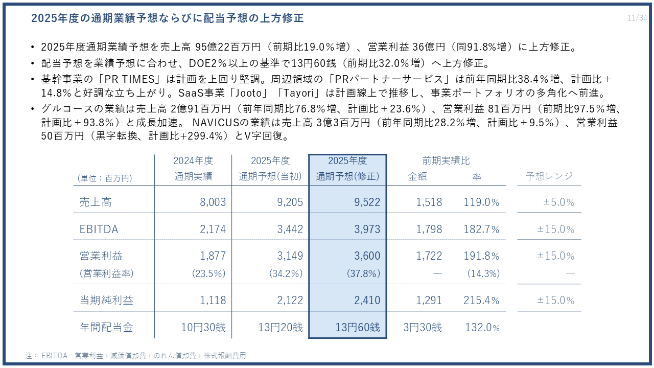 2025年度通期業績予想を売上高 95億2200万円(前期比19.0%増)、営業利益 36億円(同91.8%増)に上方修正しました。配当予想を業績予想に合わせ、DOE2%以上の基準で13円60銭(前期比32.0%増)へ上方修正しました。