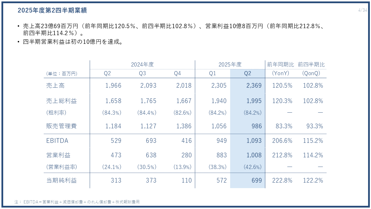 2025年度第2四半期の業績は、売上高23億6900万円、EBITDA10億9300万円、営業利益10億800万円、当期純利益6億9900万円となりました。営業利益が四半期で初めて10億円を超えました。