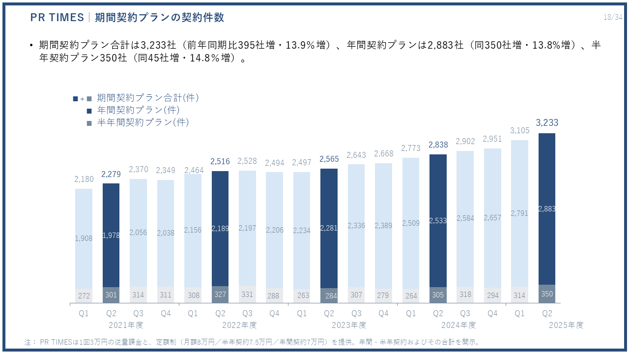 定額課金の期間契約プラン合計は3233社(前年同期比395社増・13.9%増)で、内訳としては、年間契約プラン2883社(前年同期比350社増・13.8%増)、半年契約プラン350社(前年同期比45社増・14.8%増)となっています。