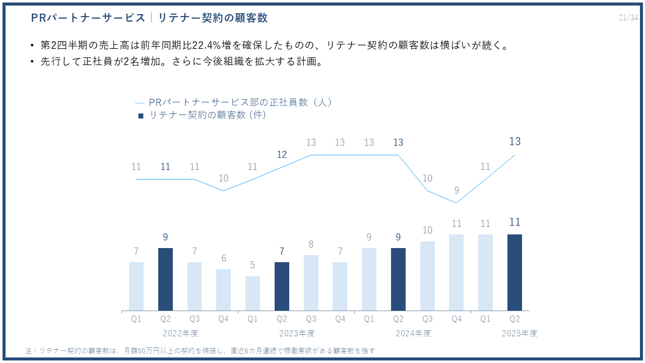 第2四半期の売上高は前年同期比で22.4%増と、順調に伸びていますが、リテナー契約の顧客数は11件と、ほぼ横ばいで推移しています。足元では、先行して正社員を2名増員しました。データとAIを活用したサービス開発、そしてメンバーの能力トレーニングを両輪で進めながら、顧客創造に挑んでいます。