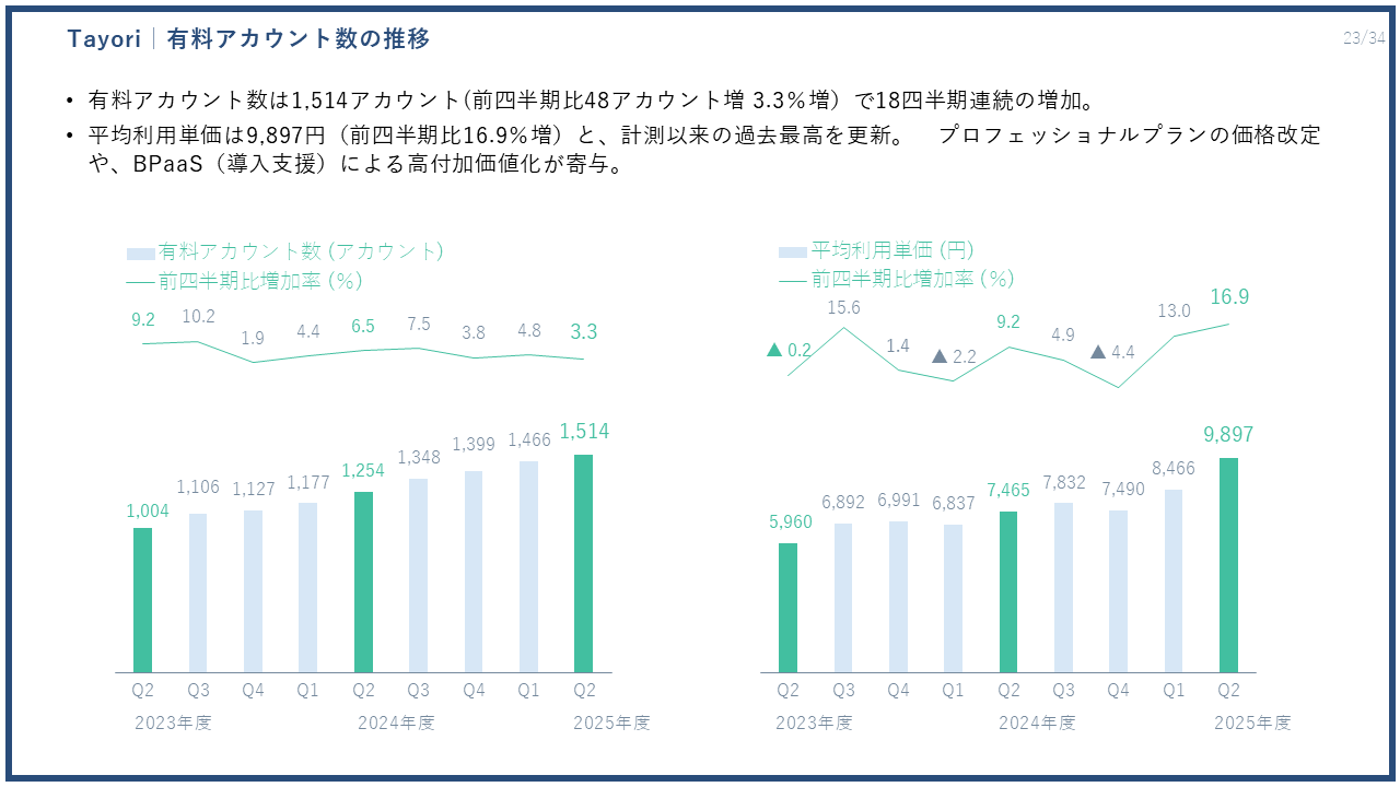1アカウントあたりの平均利用単価は9897円で前四半期比16.9%増と、プロフェッショナルプランの価格改定やBPaaS(導入支援など)による高付加価値化が寄与し、計測以来で過去最高を更新しました。