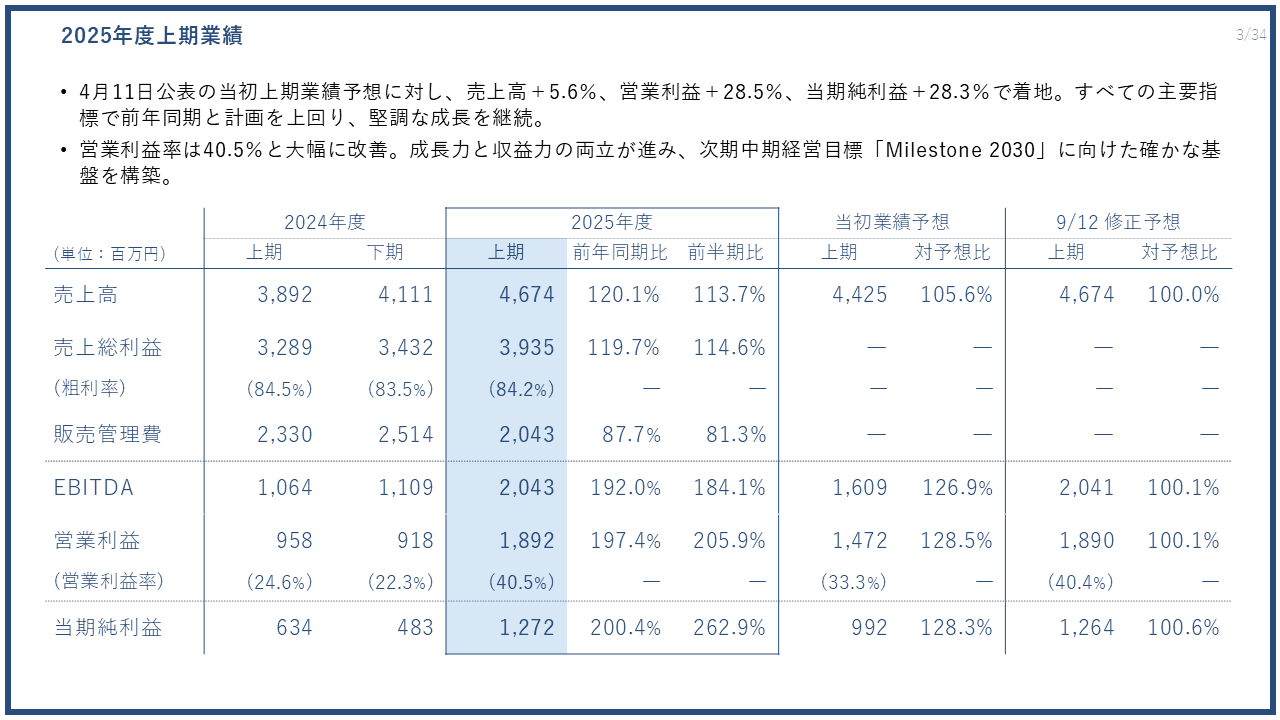 また、今年4月11日に公表した上期業績予想に対して、売上高で105.6%、EBITDAで126.9%、営業利益で128.5%、当期純利益で128.3%で着地しております。また、営業利益率は40.5%と、前年同期の24.6%から大幅に改善し、成長力と収益力の両立が進んでいます。次の5ヵ年の中期経営目標策定に向け、持続的な成長軌道を確立できた半年だと振り返っています。