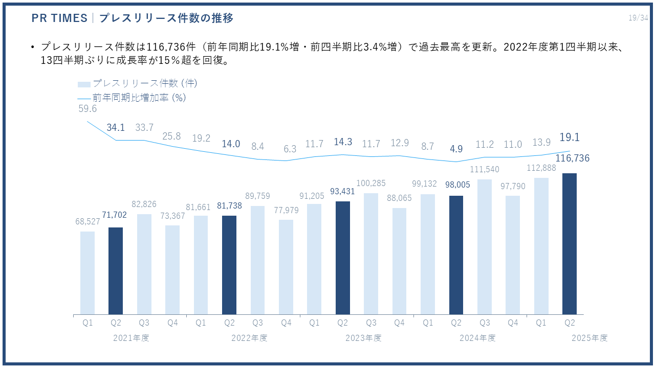 2025年度第2四半期のプレスリリース件数は、11万6736件(前年同期比19.1%増、前四半期比3.4%増)で過去最高を更新しました。成長率は、2022年度第1四半期以来、13四半期ぶりに15%超を回復しています。