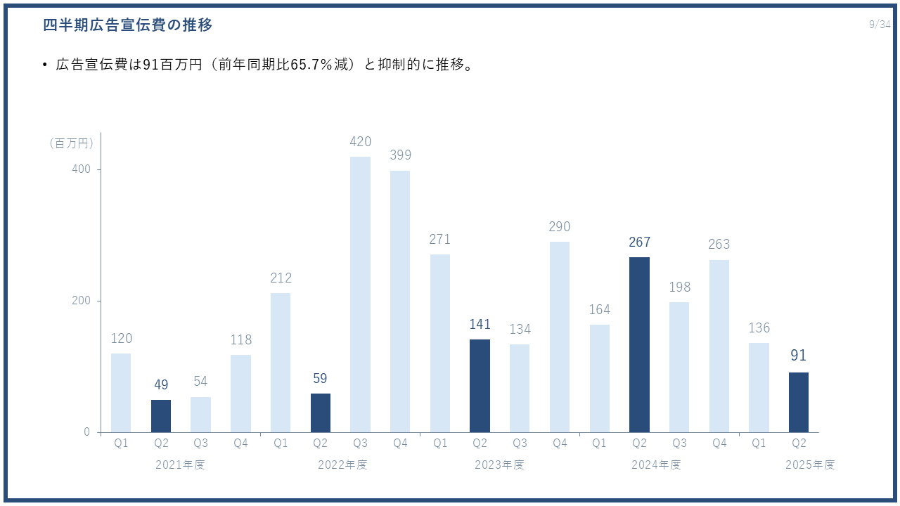 S&Mの中で、四半期の広告宣伝費は9100万円、前年同期比で65.7%減となりました。計画的に広告投資を前年と比べて大きく抑制しました。