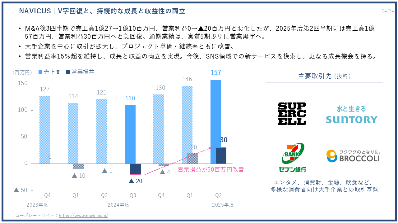 NAVICUSは、3四半期連続で成長し、2四半期連続で営業黒字へ転じました。M&A後は、売上1億100万円、営業損失2000万円まで悪化していましたが、2025年度第2四半期には売上高1億5700万円、営業利益3000万円へと急回復しました。通期では、実質5期ぶりの営業黒字を見込んでいます。