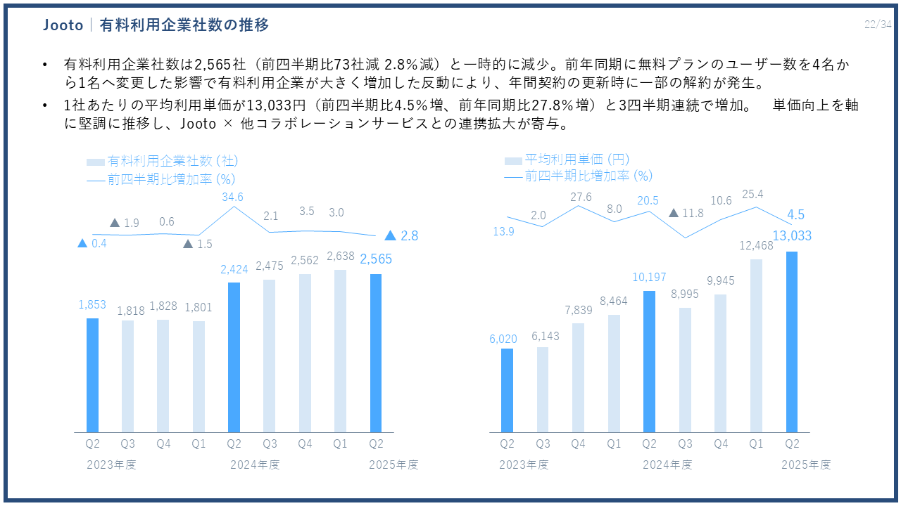 2025年8月末時点の有料利用企業社数は2565社に達し、前四半期比で73社減(2.8%減)となりました。前年同期に無料プランのユーザー数を4名から1名に変更した影響で、有料利用企業が大きく増加した反動により、年間契約の更新時に一部の解約が発生しています。一方で、1社あたりの平均利用単価は1万3033円となり、前四半期比で4.5%増加いたしました。3四半期連続で増加し、堅調に推移しています。Jootoと他社のコラボレーションサービスとの連携拡大が寄与しました。