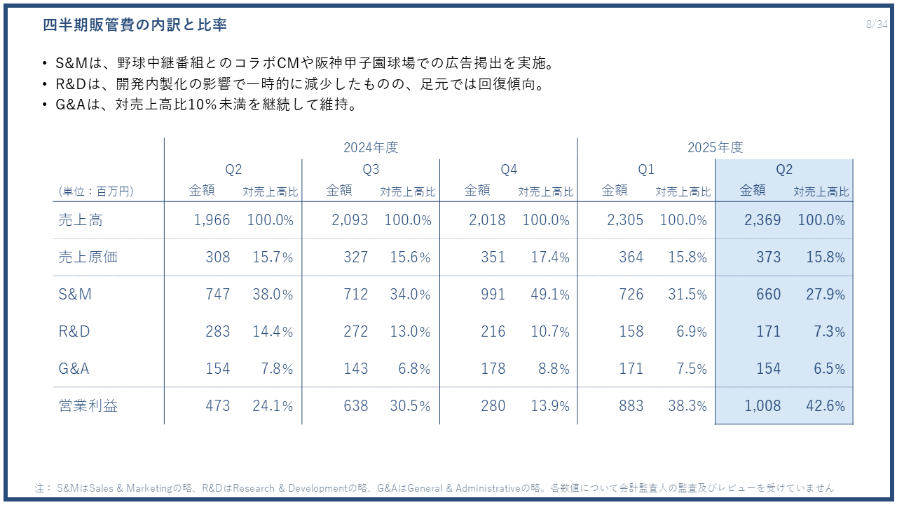 S&Mは、野球中継番組とのコラボCMや阪神甲子園球場での広告掲出を実施しました。R&Dは、開発の内製化で一時的に減少していますが、足元では回復傾向にあります。G&Aは、対売上高比で10%未満を維持しています。