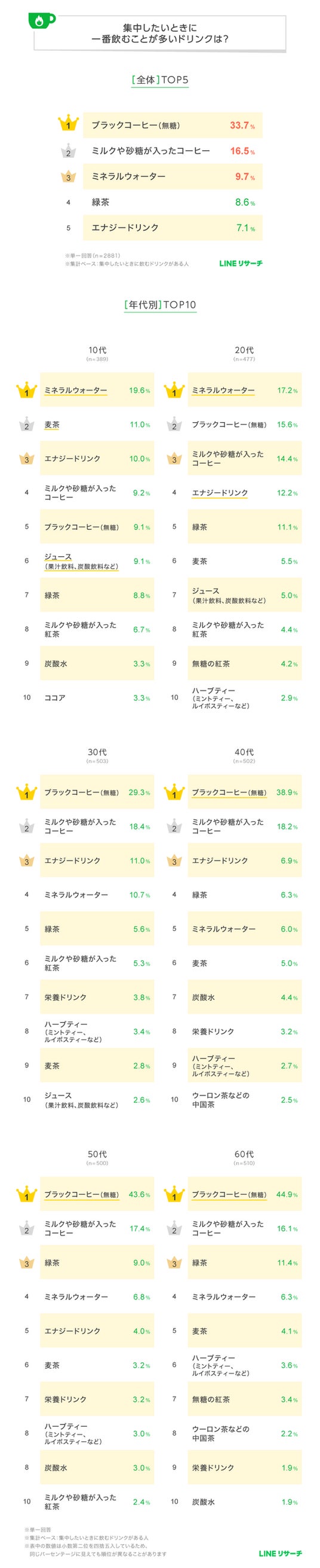 LINEリサーチ、全国の15~69歳の男女を対象に、集中したいときに一番飲むことが多いドリンクに関する調査を実施