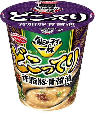 「飲み干す一杯」がタテロングカップめんで登場!砕き豚骨とポークコラーゲンで“豚がさね”し、さらに背脂をたっぷりと加えた“どこってり”スープが中太めんによく絡む!