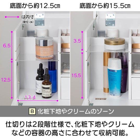 左手前は、化粧下地や日焼け止め、クリームなどの収納に。仕切り板の高さを、底面から約12.5cm・約15.5cmの2段階で調整できます。約12.5cmにした場合は上段部分の高さが約6.5cmになり、高さのあるクリームの容器も収納可能。約15.5cmにした場合は、下段部分にやや高さのある化粧下地や日焼け止め、美容液などを入れられます。仕切り板はアクリルなので、下段の奥にしまったコスメも探しやすい仕様です。